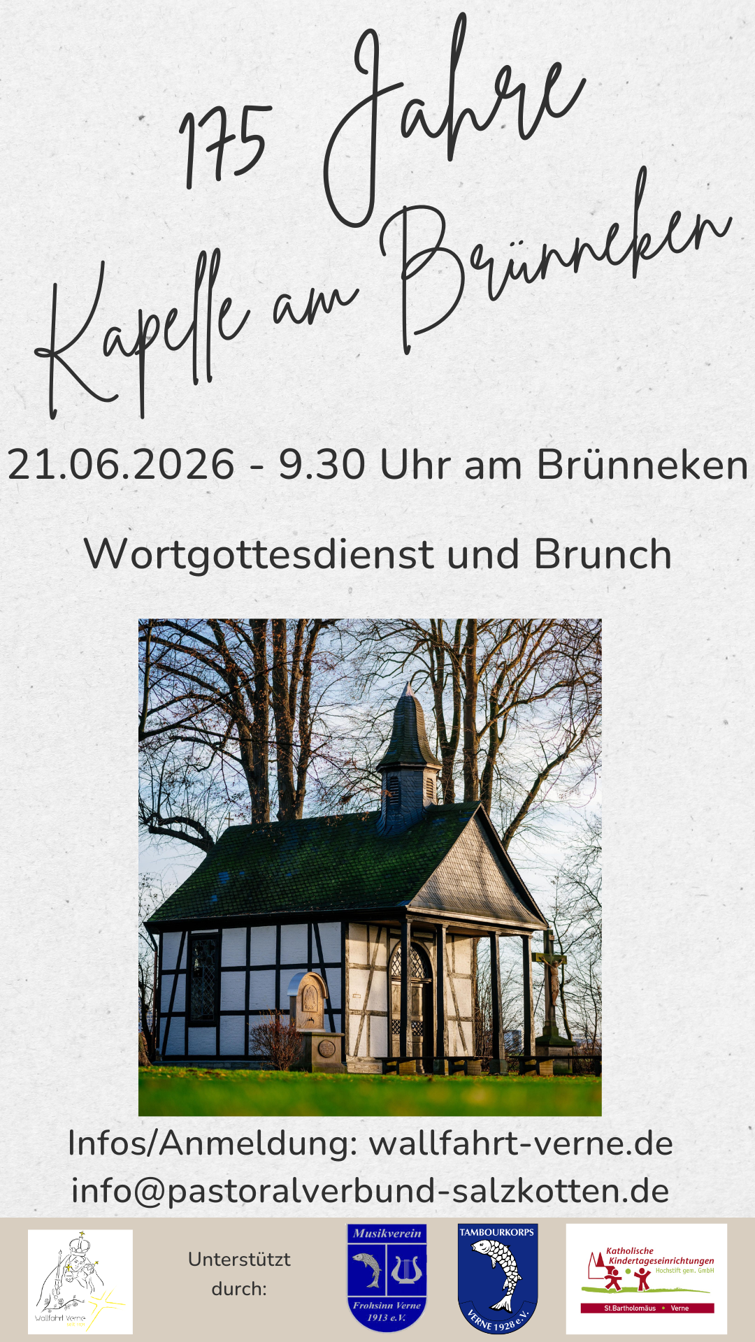 Am Sonntag, 21.06.2026, laden wir zu einem Familien-Frühstück/Brunch auf dem Brünnekengelände ein. Vor 175 Jahren wurde im Jahr 1851 die jetzige Kapelle erbaut. Wir beginnen um 9:30 Uhr mit einer