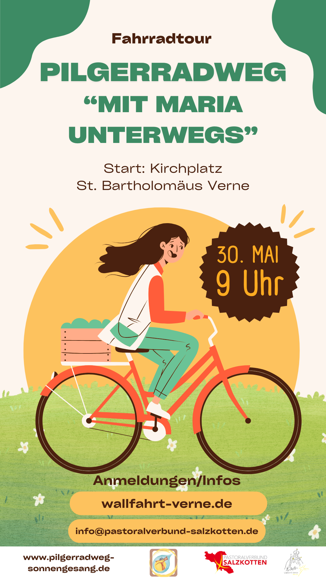 Am Samstag, 30.05.2026, starten wir um 9:00 Uhr die Pilgerradwallfahrt. Unter dem Motto „Mit Maria auf dem Pilgerradweg“ fahren wir den Rundweg (ca. 54 km) des neuen Pilgerradweges ab. Wir beginnen um 9:00 Uhr mit einem kurzen Wortgottesdienst an der Kirche in Verne. Der Weg führt am Vormittag über Tudorf und Upsprunge nach Salzkotten. Nach einer Mittagspause auf dem Gelände des Mutterhauses der Franziskanerinnen (Teilnahme am offenen Mittagstisch möglich) setzen wir den Weg über Scharmede, Thüle, Mantinghausen, Verlar und Holsen fort. In den Kirchengemeinden des Pastoralverbundes findet jeweils an den Stelen ein geistlicher Impuls statt. Nach der Rückkehr in Verne stärken wir uns bei Kaffee und Kuchen und beenden die Wallfahrt mit der Vorabendmesse um 18:00 Uhr in der Pfarr- und Wallfahrtskirche.