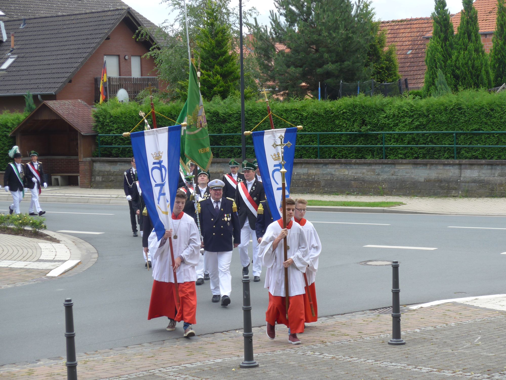 [03.07.16] Wie traditionell in jedem Jahr am ersten Julisonntag haben wir auch in diesem Jahr die nun 253. Paderborner Stadtprozession vom Paderborner Dom nach Verne an dem Drei-Hoch-Würden Stein in Verne abgeholt. Im Anschluss folgte die Abschlussmesse hinter der Pfarrkirche mit musikalischer Begleitung des Musikvereins "Frohsinn" Verne.